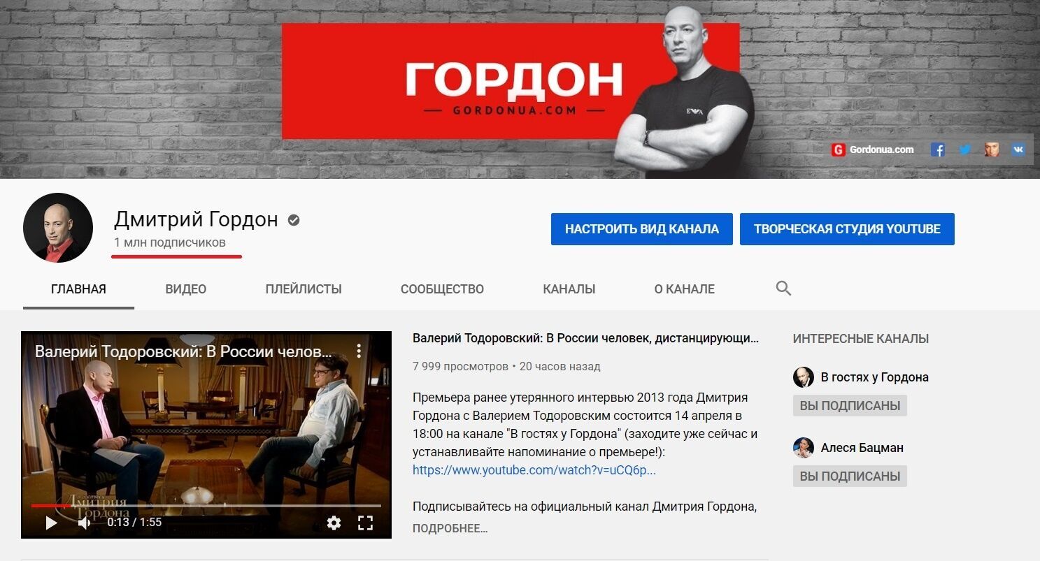 14 квітня кількість підписників на YouTube-каналі засновника інтернет-видання "ГОРДОН" Дмитра Гордона збільшилася до 1 млн, повідомив журналіст у своєму відеозверненні.