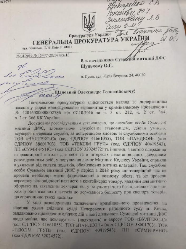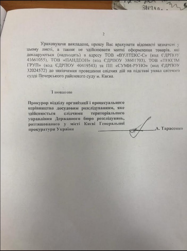 Овсієнко також повідомив, що на адресу Щуцького було надіслано лист від одного з прокурорів Генпрокуратури, у якому він вказує не проводити митного оформлення товарів "Вултекс-С".