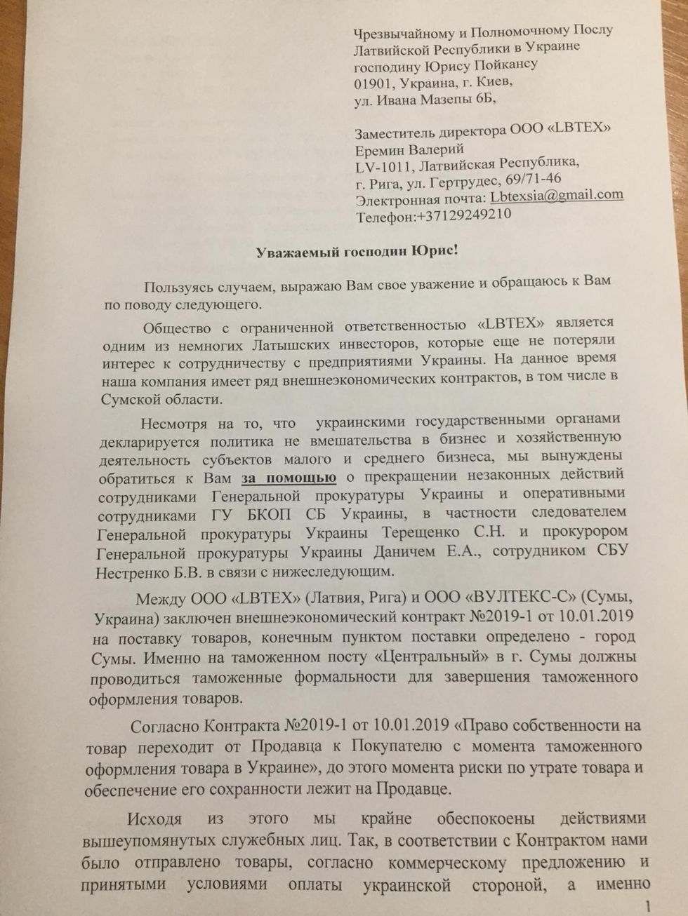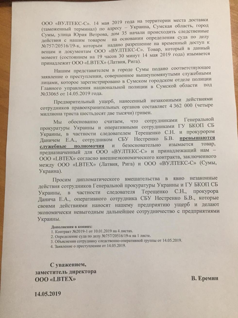 Єрьомін повідомив посла, що між LBTEX та сумською компанією "Вултекс-С" укладено зовнішньоекономічний контракт, завершує оформлення товарів Сумська митниця, а право власності переходить від продавця до покупця з моменту митного оформлення товару в Україні. Керівник заявив, що 14 травня 2019 року на митному терміналі було вилучено товари, які належать його компанії. Він розцінює такі дії митників як незаконні.