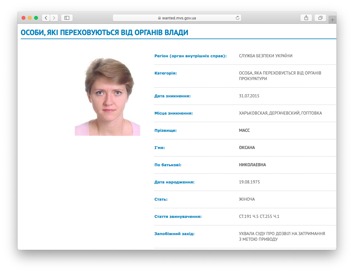 25 березня 2016 року Оксані Масс було надіслано повідомлення про підозру, того ж дня її оголосили в розшук по Україні, потім і в міжнародний.