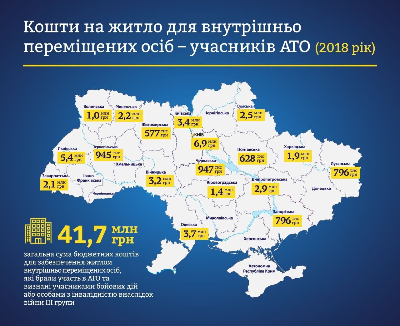 Станом на липень 2018 року для забезпечення житлом цієї категорії потрібно було додатково виділити з бюджету 16,7 млн грн, уряд своїм розпорядженням збільшив статтю витрат саме на цю суму. Тепер видатки за цією бюджетною програмою на 2018 рік становитимуть 41,7 млн грн.