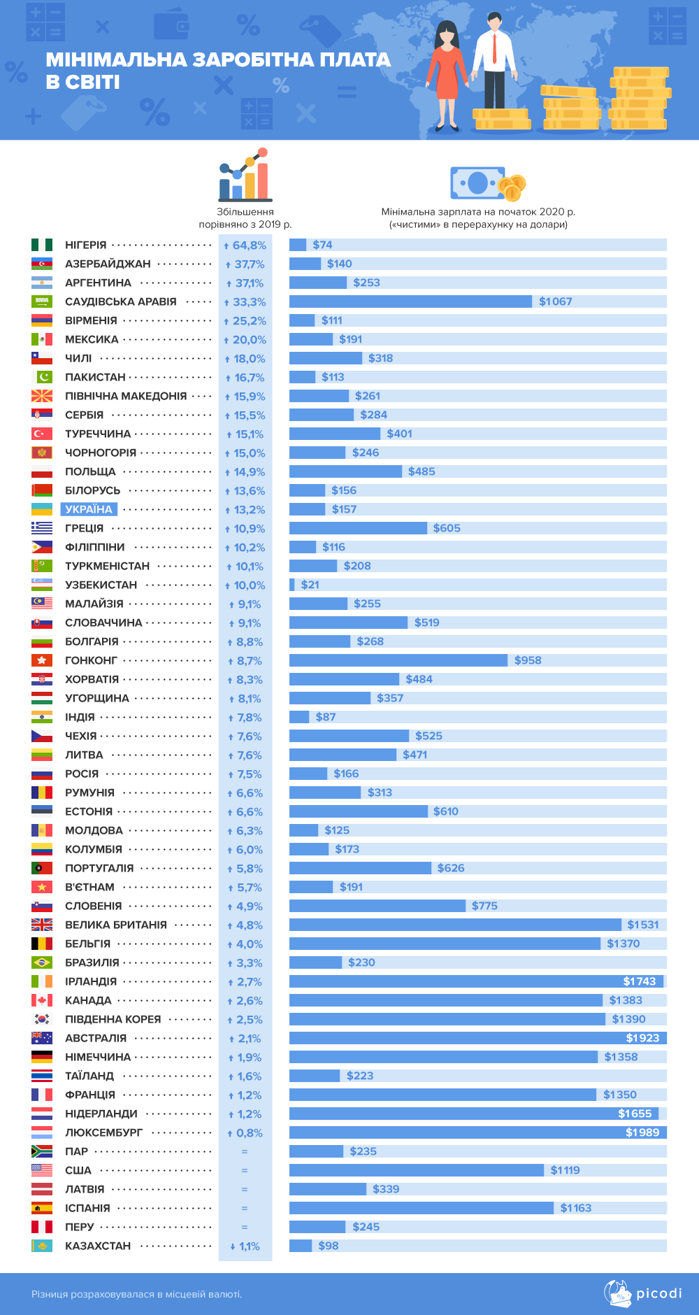 У 2020 році в Україні мінімальна заробітна плата зросла на 13,2%. У Білорусі мінімальний показник зріс на 13,6%, у Росії – на 7,5%, у Польщі – на 14,9%, а в Німеччині – на 1,9%.