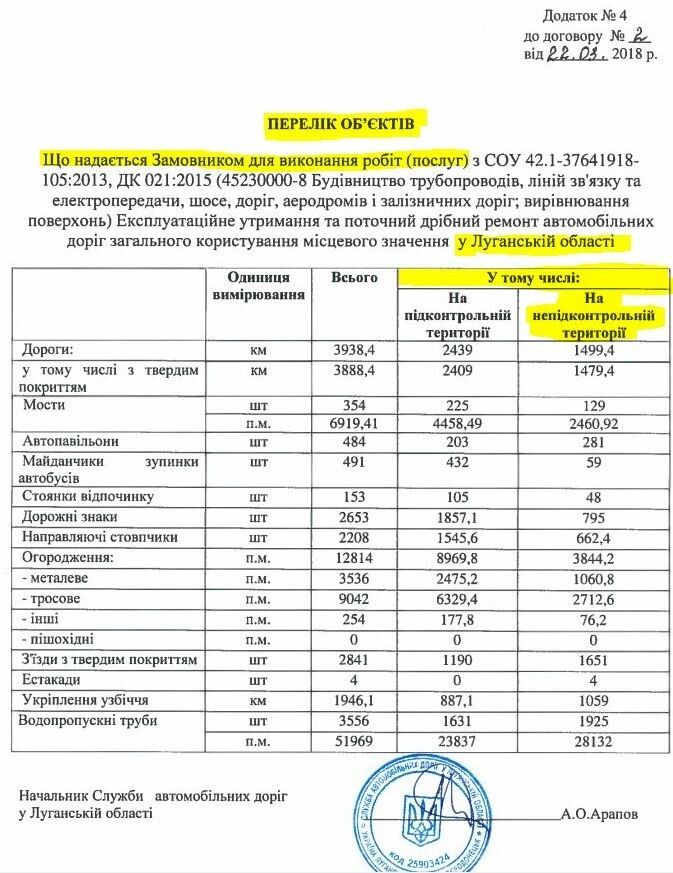 Активісти розповіли, що такі роботи було вказано в додатку до договору між держвідомством і ТОВ "Євро-Буд Компані" на 150,11 млн грн від березня цього року. Зокрема, на не підконтрольних Києву територіях Луганської області затвердили встановлення сотень дорожніх знаків, десятків мостів, естакад та іншого.