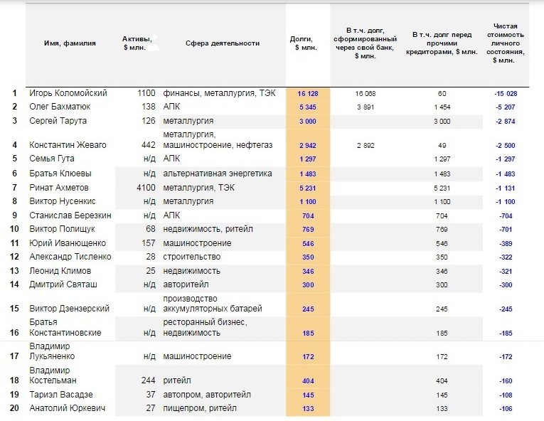 За даними "Бізнеса", найбільшим боржником є Ігор Коломойський. Сума його боргів – $16,128 млрд, а активи коштують $1,1 млрд. Борг склався з кредитних зобов'язань "Приватбанку", пов'язаних із власниками компаній (120 млрд грн, із яких близько 60 млрд – частка Коломойського), боргу компанії МАУ в 1 млрд грн і "Укрнафти" – близько 12 млрд грн.