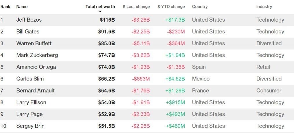 Засновник соціальної мережі Facebook Марк Цукерберг утратив $3,6 млрд, а статки найбагатшої людини світу, засновника Amazon Джеффа Безоса, зменшилися на $3,3 млрд.