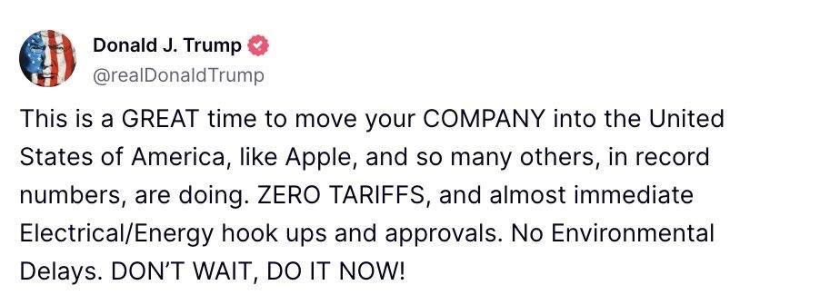 "Це чудовий час, щоб перемістити свою компанію у Сполучені Штати Америки, як це роблять Apple і багато інших у рекордній кількості", – написав Трамп.