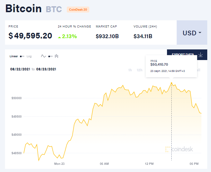 23 серпня вартість біткоіна зросла вище за $50 тис. Про це свідчать дані криптовалютної біржі Coindesk.