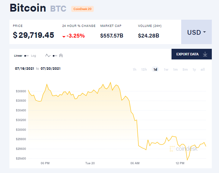 Канал CNBC зазначає, що вартість біткоіна впала нижче за $30 тис. уперше з 22 червня. Причиною цього став великий розпродаж на світових фондових ринках. У понеділок, 19 липня, для індексу Доу Джонса "був найгірший день" із жовтня минулого року, зазначив канал. Унаслідок цього впали ризикові активи.