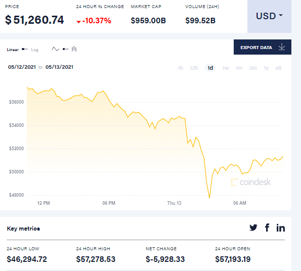 На тлі оголошення Маска курс криптовалюти почав падати, за добу він знизився на 10%. Станом на 10.00 за київським часом він становив $51,2 тис. Про це свідчать дані біржі Coindesk.