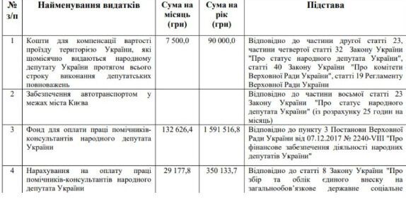 По 1,59 млн грн, передбачені у кошторисі, – це фонд оплати праці помічників-консультантів кожного нардепа. "Судово-юридична газета" зазначає, що посадові оклади народних депутатів 2025 року порівняно з 2024 роком не зміняться, водночас з 1 липня оплату праці помічників-консультантів нардепів збільшено з 29,2 до 43,8 прожиткових мінімумів, зараз вона становить від 88,4 до 132,6 тис. грн на місяць.