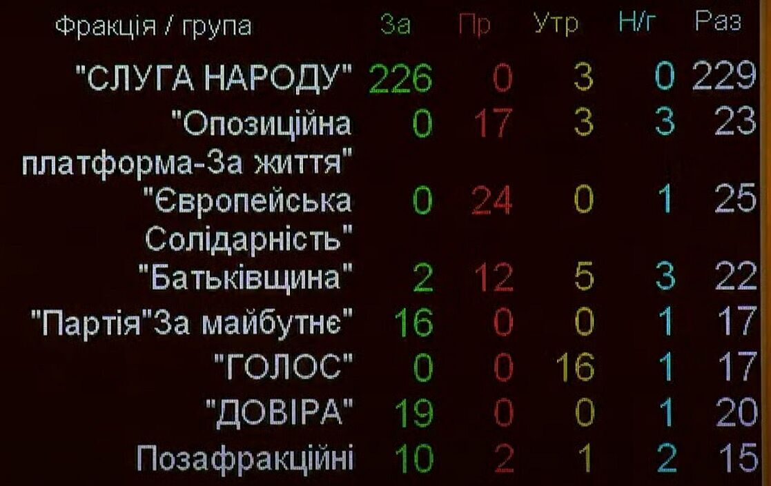 Нардепи від "Слуги народу" дали 226 голосів – рівно стільки, скільки потрібно для затвердження. Ще троє людей із цієї фракції утрималися.