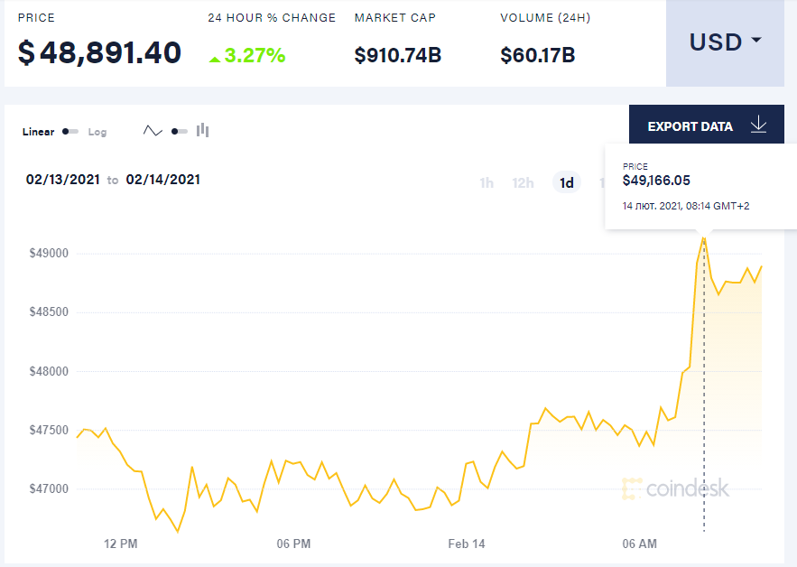 Курс криптовалюти біткоін побив рекорд, сягнувши 14 лютого позначки $49 тис. Про це свідчать дані криптовалютної біржі Coindesk.