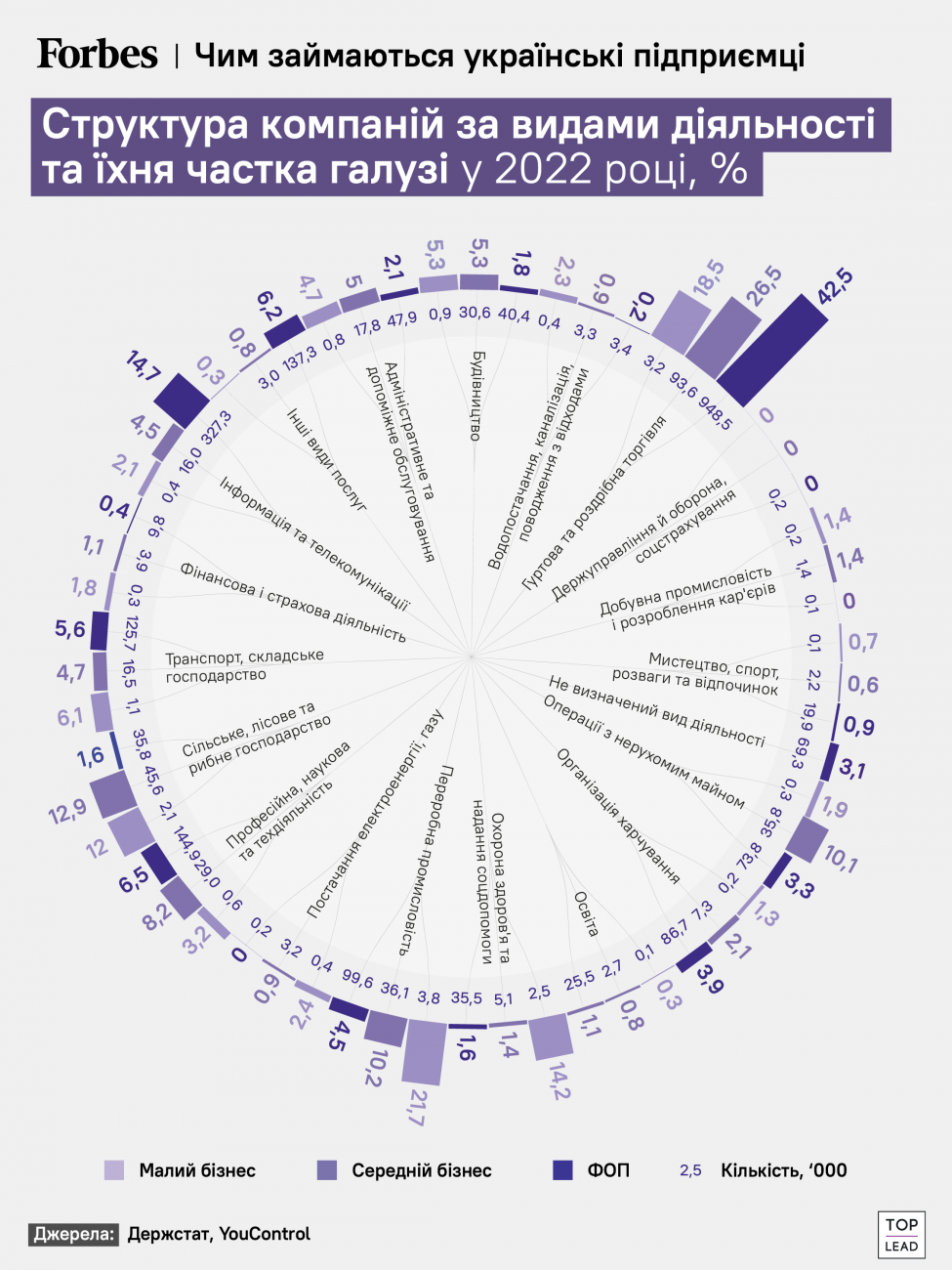 Найбільше в Україні бізнесів, які займаються торгівлею, промисловістю й нерухомістю.