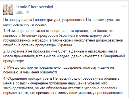 "Дані про теперішнє місце мого проживання, зокрема й адреса, давно є в ГПУ. Мені досі не висунуто підозри, тому я навіть не розумію, у чому мене обвинувачують. Звернення прокуратури до Печерського суду з вимогою оголосити мене в розшук – чергове брутальне порушення українського законодавства, за що обов'язково відповідатимуть у кримінально-правовому порядку всі ті, хто причетні до мого політичного переслідування!" – написав він.