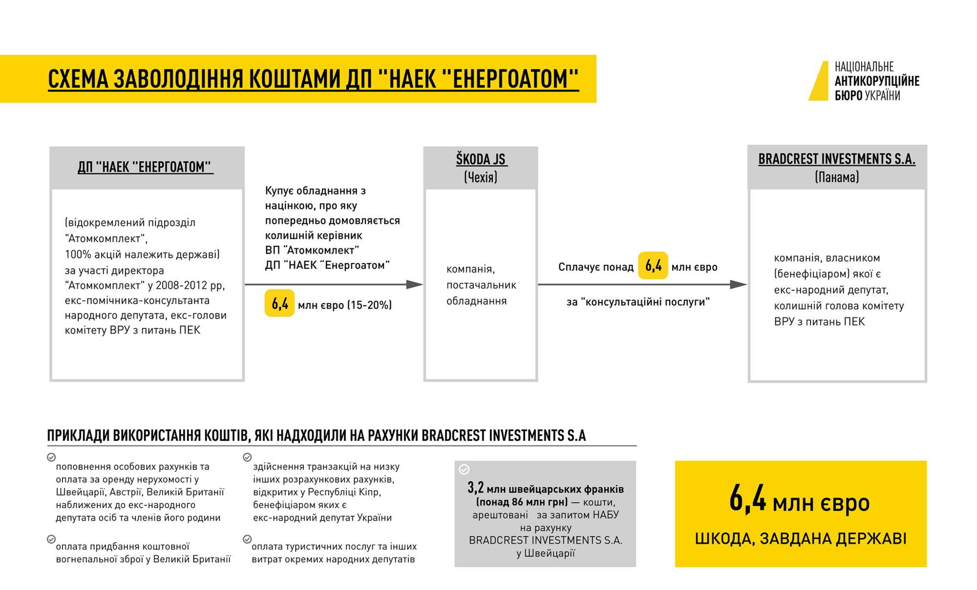 "Після отримання зазначених коштів за контрактами, укладеними з підприємством "Енергоатом", Škoda JS переказала €6,4 млн на рахунок компанії Bradcrest Investments SA (Панамська Республіка), єдиним власником (бенефіціаром) якої є колишній народний депутат України", – повідомили в НАБУ.