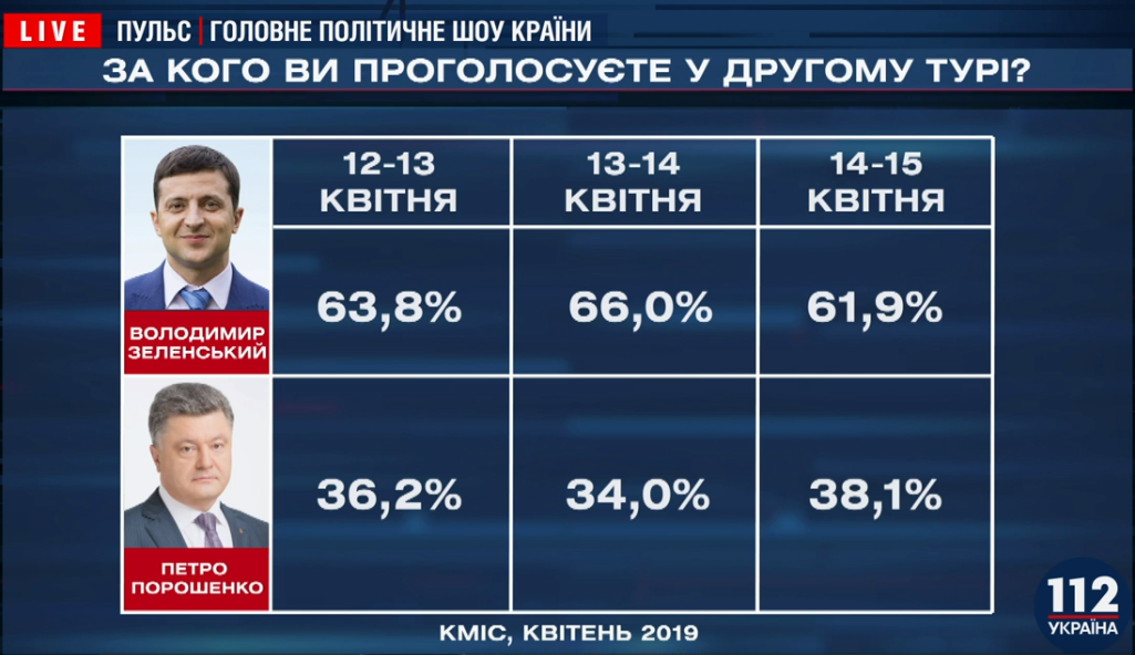 КолиПорошенкоговоривпро цифрирейтингу,нателеканалі"112Україна"показалиінфографіку.Згідно із зображенням,за данимиКиївськогоміжнародногоінститутусоціологіїна12–13 квітня,заЗеленськогов другомутуріготовіпроголосувати63,8%респондентів,заПорошенка – 36,2%.За данимина13–14 квітняцифривказанітакі:заЗеленського – 66%респондентів,заПорошенка – 34%.На14–15 квітняпоказанотакіцифри:Зеленський – 61,9%,Порошенко – 38,1%.