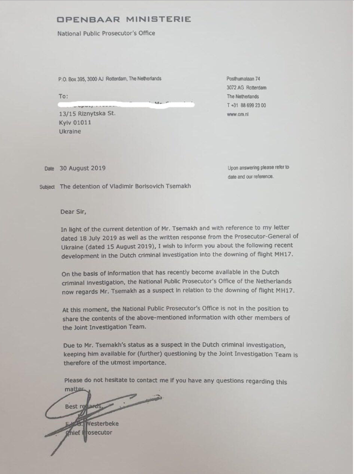 Колишній начальник "бригади протиповітряної оборони ДНР" Володимир Цемах є підозрюваним у справі про катастрофу малайзійського Boeing, і міжнародна слідча група (JIT) повинна мати можливість його допитати. Про це йдеться у листі головного прокурора Нідерландів Фреда Вестербеке, який 30 серпня було надіслано Генеральній прокуратурі України. Текст листа є в розпорядженні видання "theБабель".