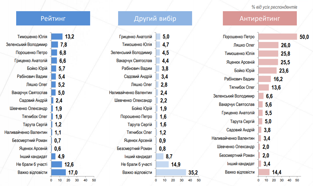 Антирейтинг політиків очолює Порошенко. За нього за жодних обставин не проголосувала б половина виборців. Олега Ляшка (Радикальна партія), Тимошенко, Арсенія Яценюка ("Народний фронт") і Юрія Бойка (Опозиційний блок) не підтримало б приблизно 25% опитаних.