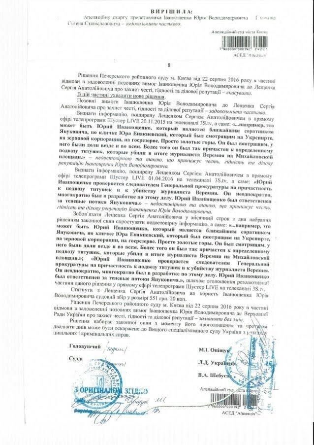 "Апеляційний суд зажадав від Сергія Лещенка спростувати недостовірну інформацію про Юрія Іванющенка, а саме про причетність до корупційних схем в "Укрспирті" і "Держрезерві", про причетність до підвозу так званих тітушок під час Євромайдану, про причетність до вбивства журналіста В'ячеслава Веремія, про те, що Іванющенко неодноразово був у розробленні ГПУ, про те, що Юрій Іванющенко відповідальний за тіньові потоки Януковича. Як бачимо, Лещенку спростовувати і спростовувати брехню й ахінею, яку він наговорив", – сказав адвокат у коментарі агентству і надав копію рішення суду.