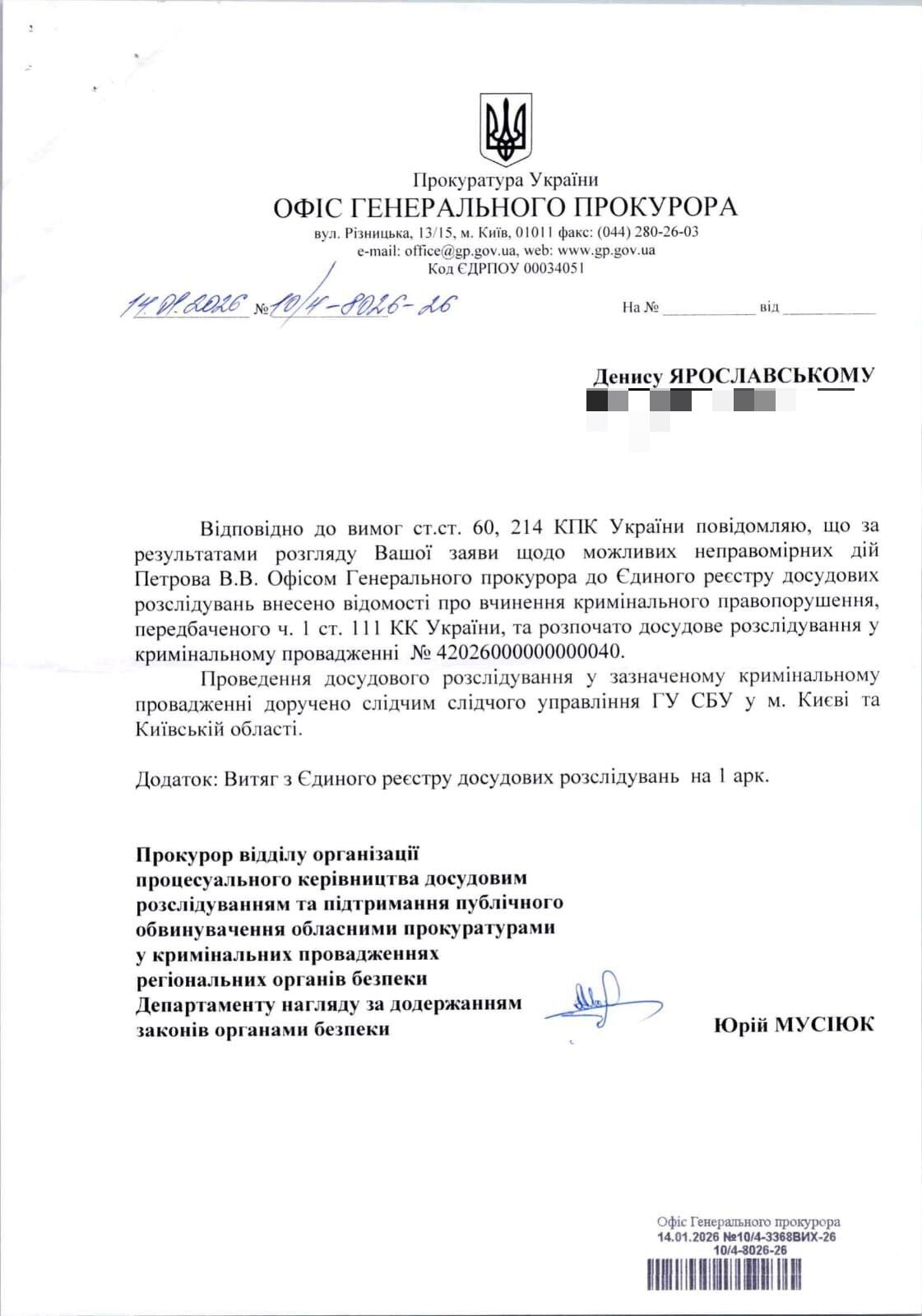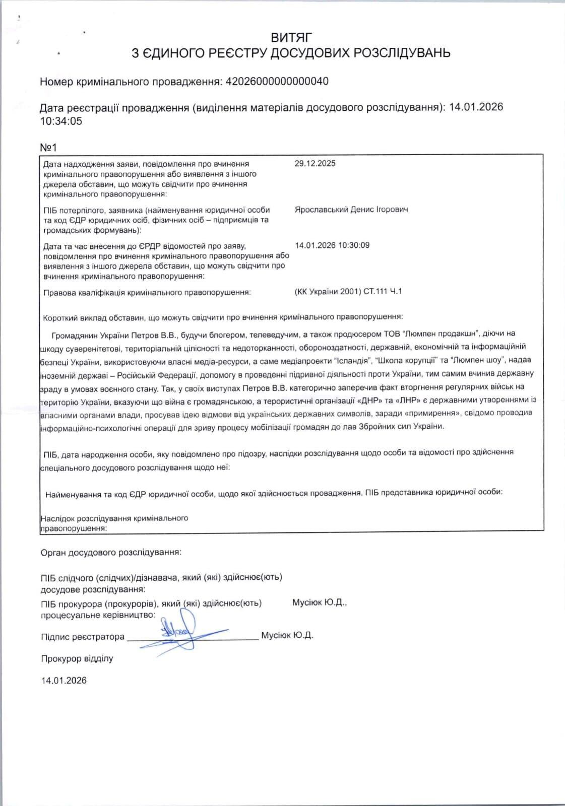 У витягу з Єдиного реєстру досудових розслідувань, доданому до відповіді, викладено обставини, які можуть свідчити про держзраду з боку Петрова: "Громадянин України Петров В.В., будучи блогером, телеведучим, а також продюсером ТОВ "Люмпен продакшн", діючи на шкоду суверенітетові, територіальній цілісності та недоторканності, обороноздатності, державній, економічній та інформаційній безпеці України, використовуючи власні медіаресурси, а саме медіапроєкти "Ісландія", "Школа корупції" та "Люмпен шоу", надав іноземній державі – Російській Федерації – допомогу у проведенні підривної діяльності проти України, тим самим вчинив державну зраду в умовах воєнного стану".