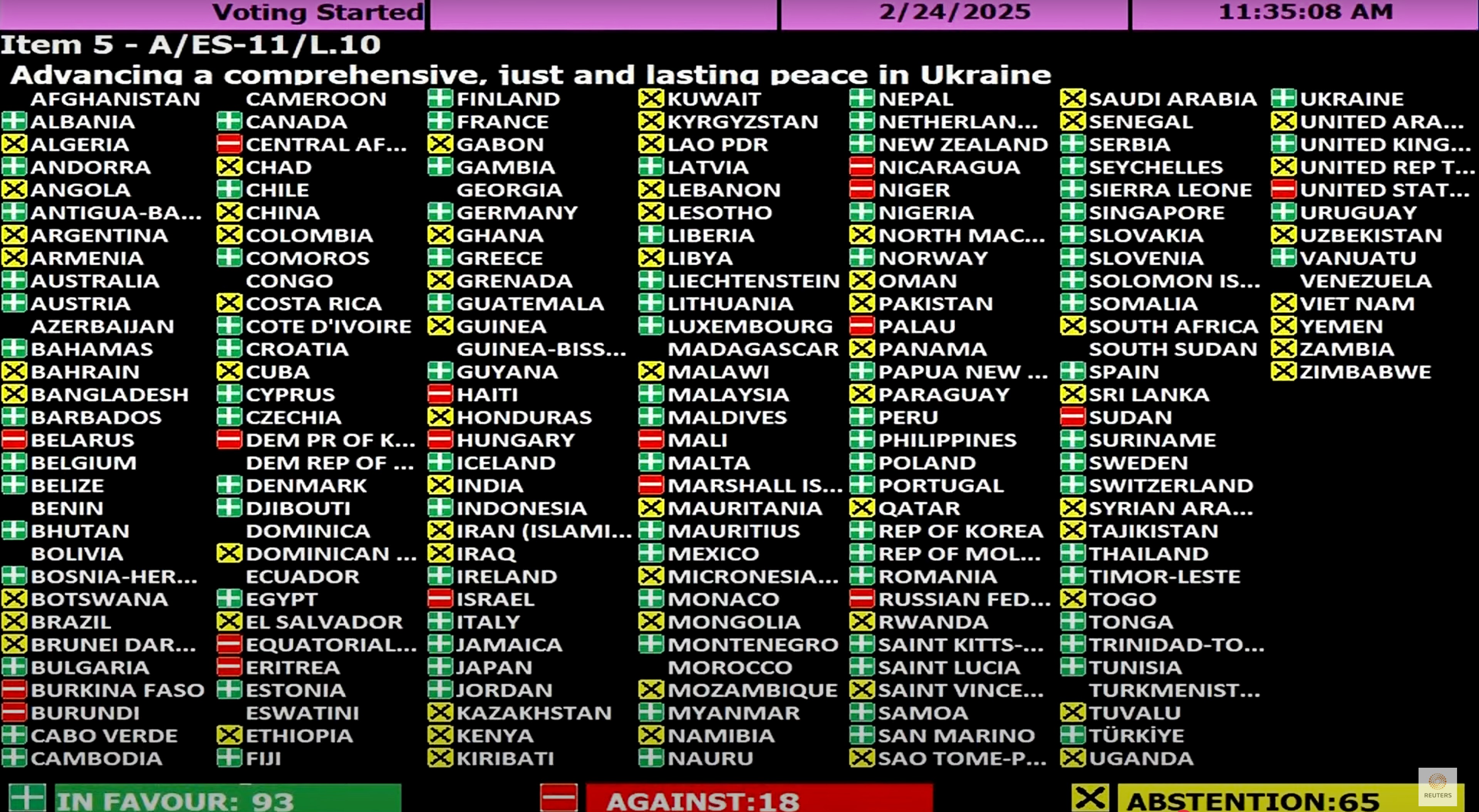 Резолюцію, у якій Росію називають країною-агресором і вимагають від неї вивести збройні сили з території України в межах її міжнародно визнаних кордонів, підтримало 93 країни – члени ООН. Водночас 18 країн були проти, ще 65 утрималися.