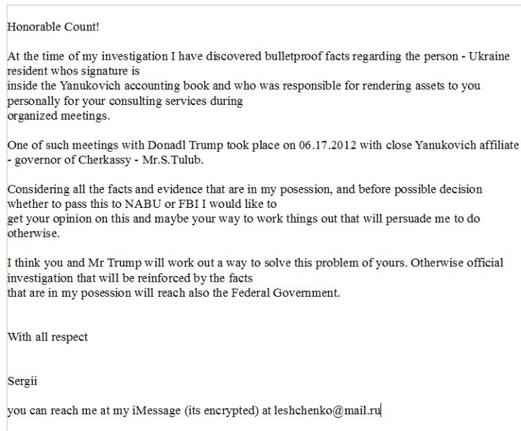 У ньому йшлося про те, що у автора (він підписався як "Сергій") є компромат на Манафорта і Дональда Трампа, який на той час був кандидатом у президенти США. Йшлося про фінансові домовленості між Манафортом та екс-президентом України Віктором Януковичем, а також про зустрічі Трампа з близьким до Януковича українським політиком Сергієм Тулубом у червні 2012 року.