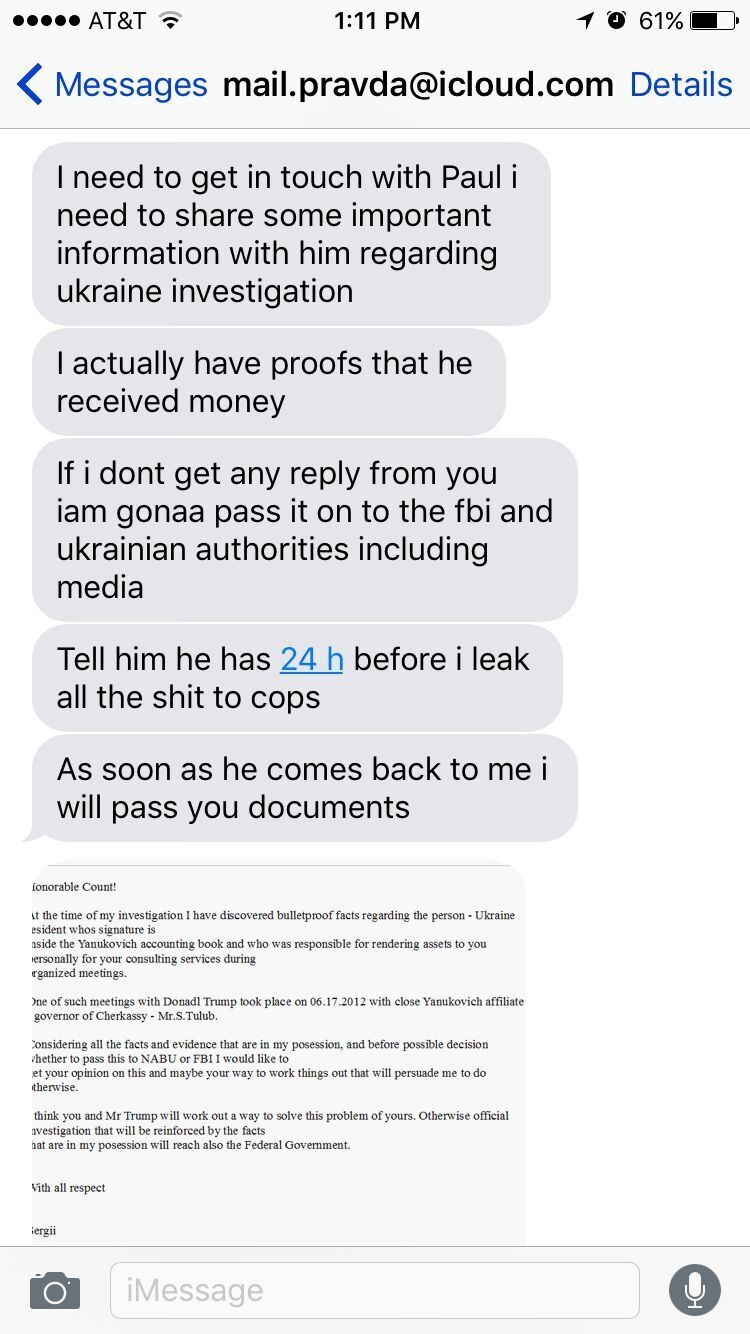 "Мені потрібно зв'язатися з Полом, я повинен поділитися важливою інформацією щодо його участі в українському розслідуванні. У мене є неспростовні докази того, що він отримував гроші. Якщо я не отримаю від вас жодної відповіді, я передам їх у ФБР і українські органи, зокрема медіа. Скажіть йому, що він має 24 години, перш ніж я надам усю інформацію правоохоронцям. Щойно він зв'яжеться зі мною, я перешлю вам документи", – йшлося в надісланих повідомленнях.