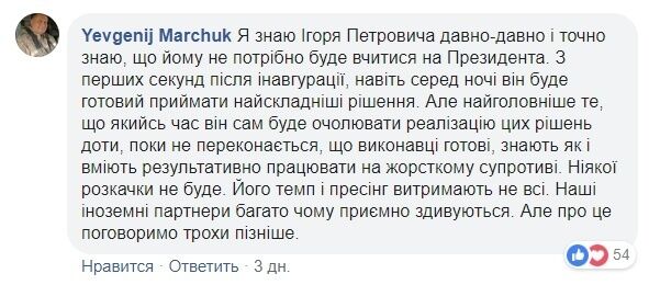 "Я знаю Ігоря Петровича давно-давно і точно знаю, що йому не потрібно буде вчитися на президента. З перших секунд після інавгурації, навіть серед ночі, він буде готовий приймати найскладніші рішення. Але найголовніше, що якийсь час він сам буде очолювати реалізацію цих рішень доти, поки не переконається, що виконавці готові, знають як і вміють результативно працювати на жорсткому супротиві", – написав він.