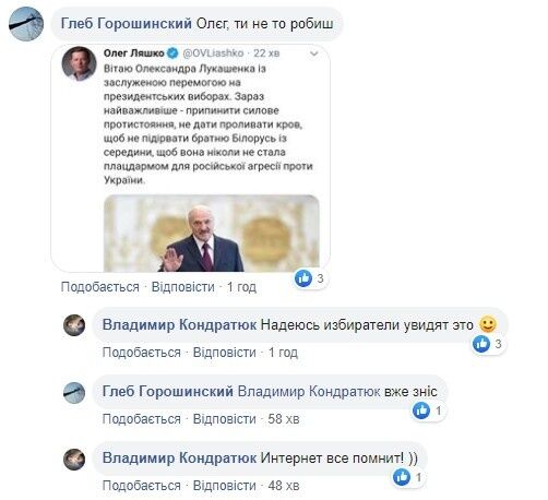 Лідер Радикальної партії й екснардеп Олег Ляшко привітав президента Білорусі Олександра Лукашенка з перемогою на виборах. Відповідний пост він розмістив у своїх соціальних мережах, але невдовзі видалив його. Скріншот повідомлення Ляшка у Twitter опублікував блогер Олександр Барабошко.