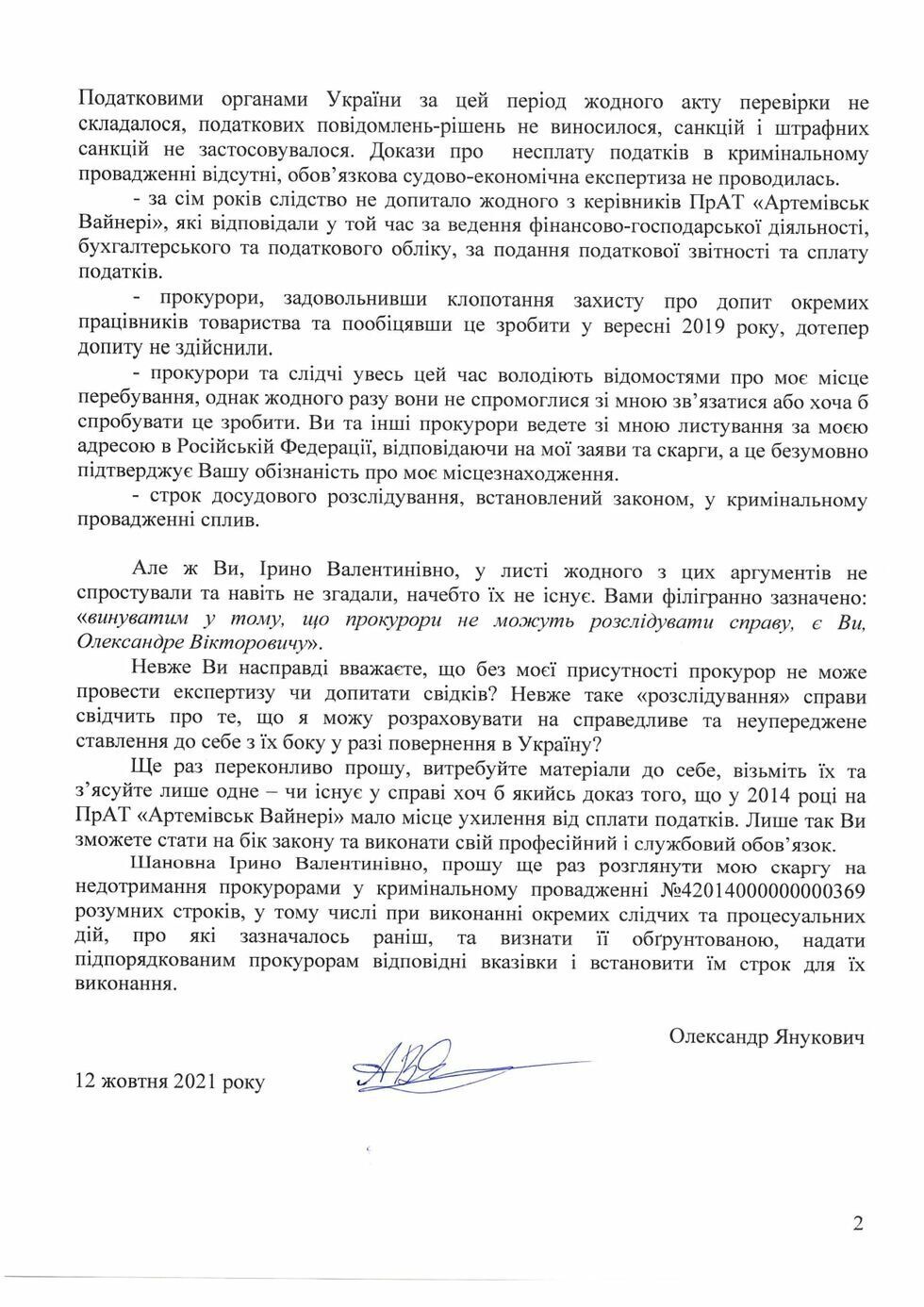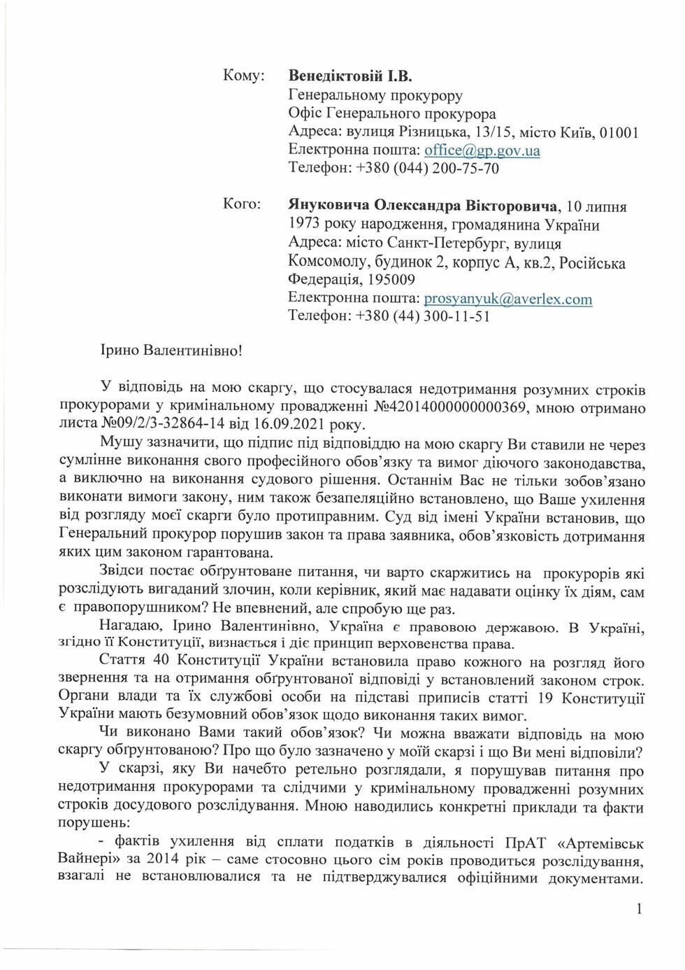 "Прокуратура продовжує семирічну бездіяльність у кримінальному провадженні проти Олександра Януковича про нібито ухиляння від сплати податків ПрАТ "Артемівськ Вайнері". У відповідь на його публічну скаргу і вимогу про свій допит Ірина Венедіктова виправдовує саботаж прокурорів у розслідуванні цієї справи. У своєму листі генеральна прокурорка стверджує, що місцеперебування Олександра Януковича органам прокуратури невідоме. Водночас сам лист надіслано за адресою перебування Олександра Януковича у РФ, про яку він неодноразово повідомляв прокуратуру", – написав Кірасир.