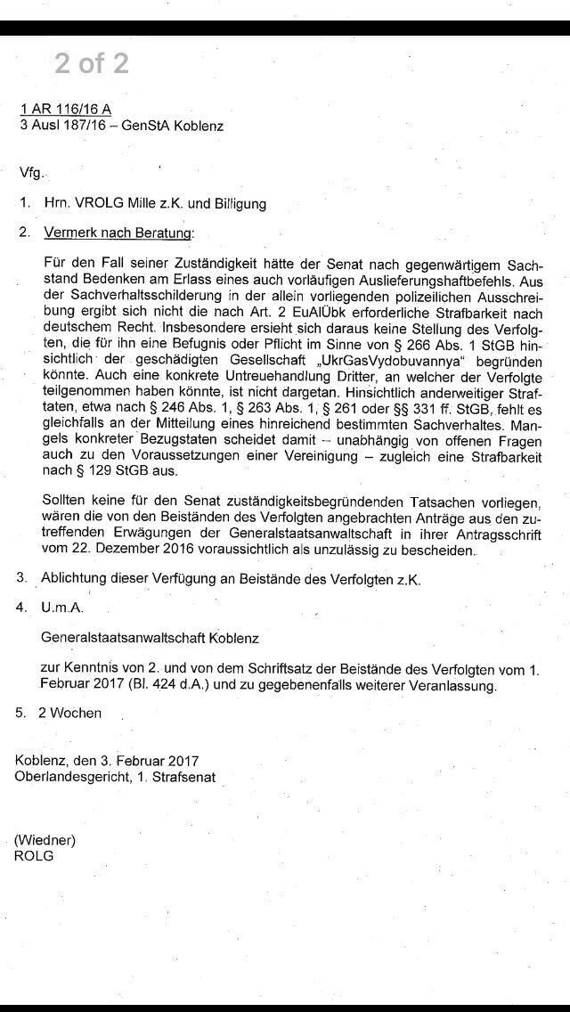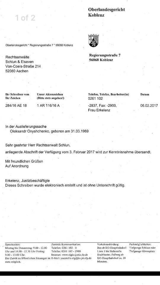 Інтернет-видання "Апостроф" опублікувало нібито цей документ. На ньому стоїть підпис суду німецького міста Кобленц. Документ датований 3 лютого 2017 року.