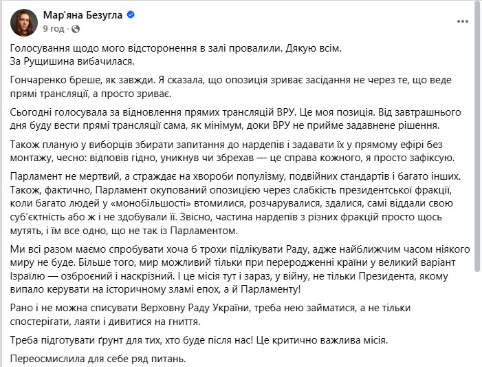 Коментуючи рішення Ради у Facebook, Безугла заявила, що перепросила за свої слова про смерть нардепа Ярослава Рущишина.