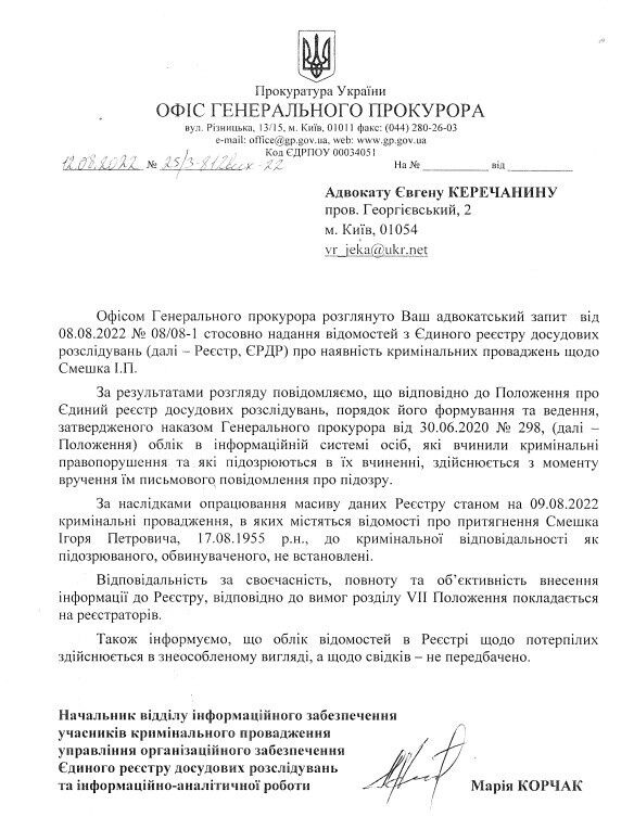 В Офісі генпрокурора повідомили, що в Єдиному реєстрі досудових розслідувань немає кримінальних проваджень щодо притягнення Смешка до відповідальності як підозрюваного чи обвинуваченого.