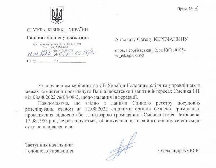 У відповіді СБУ також зазначено, що, згідно з даними Єдиного реєстру досудових розслідувань, кримінальних проваджень щодо Смешка не розслідують, обвинувальних актів до суду не надсилали.