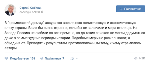 "До "кремлівської доповіді" обережно занесли всю політичну та економічну еліти країни. Було б дуже дивно, якби не включили і мера столиці. На Заході Росії не любили в усі часи, але до таких списків не могли додуматися навіть у найгірші періоди історії. Такі заходи не розколюють, а об'єднують. Зумовлюють результати, протилежні тим, до чого прагнули автори", – зазначив він.