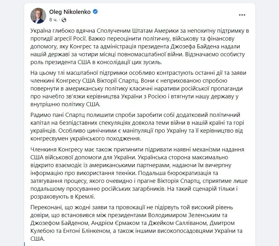 "На цьому тлі масштабної підтримки особливо контрастують останні дії та заяви членкині Конгресу США Вікторії Спартц. Вони є неприхованою спробою повернути в американську політику класичні наративи російської пропаганди про начебто зв’язки керівництва України з Росією і втягнути нашу державу у внутрішню політику США", – заявив речник.