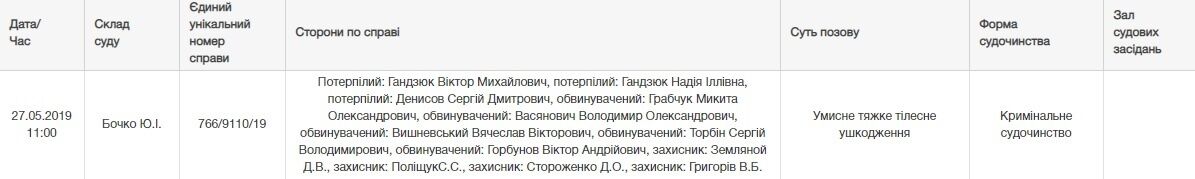 Обвинуваченими є Микита Грабчук, Володимир Васянович, В'ячеслав Вишневський, Віктор Горбунов та Сергій Торбін. Усіх їх підозрюють у заподіянні умисного тяжкого тілесного ушкодження.