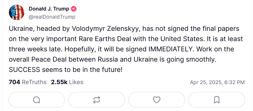 Трамп припускав, що угоду про мінерали можуть підписати 24 квітня. Однак міністр фінансів України Сергій Марченко повідомляв 24 квітня Reuters, що протягом цього тижня угоди не підпишуть, хоча наголосив, що українська сторона працює над документом "так швидко, як може".