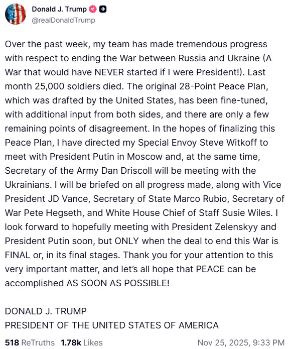 Трамп 25 листопада висловив думку, що домовленості щодо врегулювання війни країни-агресора РФ проти України дуже близькі.