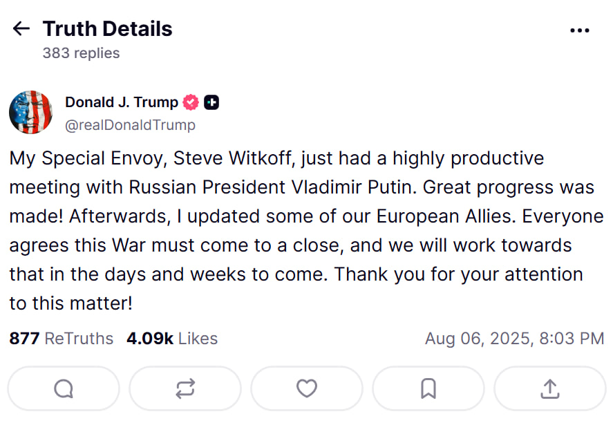 "Мій спеціальний посланник Стів Віткофф щойно провів дуже продуктивну зустріч із [нелегітимним] президентом Росії Володимиром Путіним. Було досягнуто значного прогресу!" – написав Трамп, не розголошуючи подробиць.