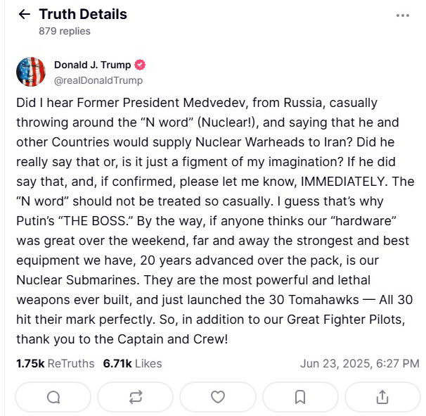 Трамп наступного дня відповів. Він запитав у своєму пості у Truth Social, чи дійсно чув, що "Медведєв з Росії недбало кинув слово на букву "я" – ядерний (в оригіналі – N word (Nuclear!). – "ГОРДОН") – і сказав, що він та інші країни постачатимуть ядерні боєголовки до Ірану".