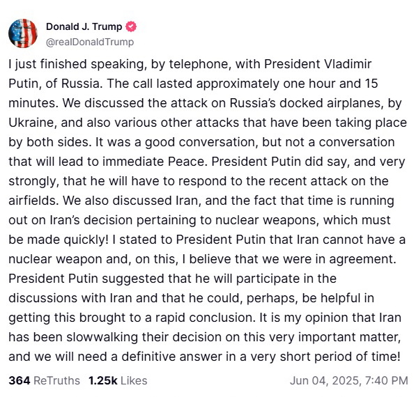 "Ми обговорили напад України на російські літаки, що стояли на авіабазах, а також різні інші атаки, які здійснюють обидві сторони. Це була гарна розмова, але не та розмова, яка приведе до негайного миру", – написав Трамп.
