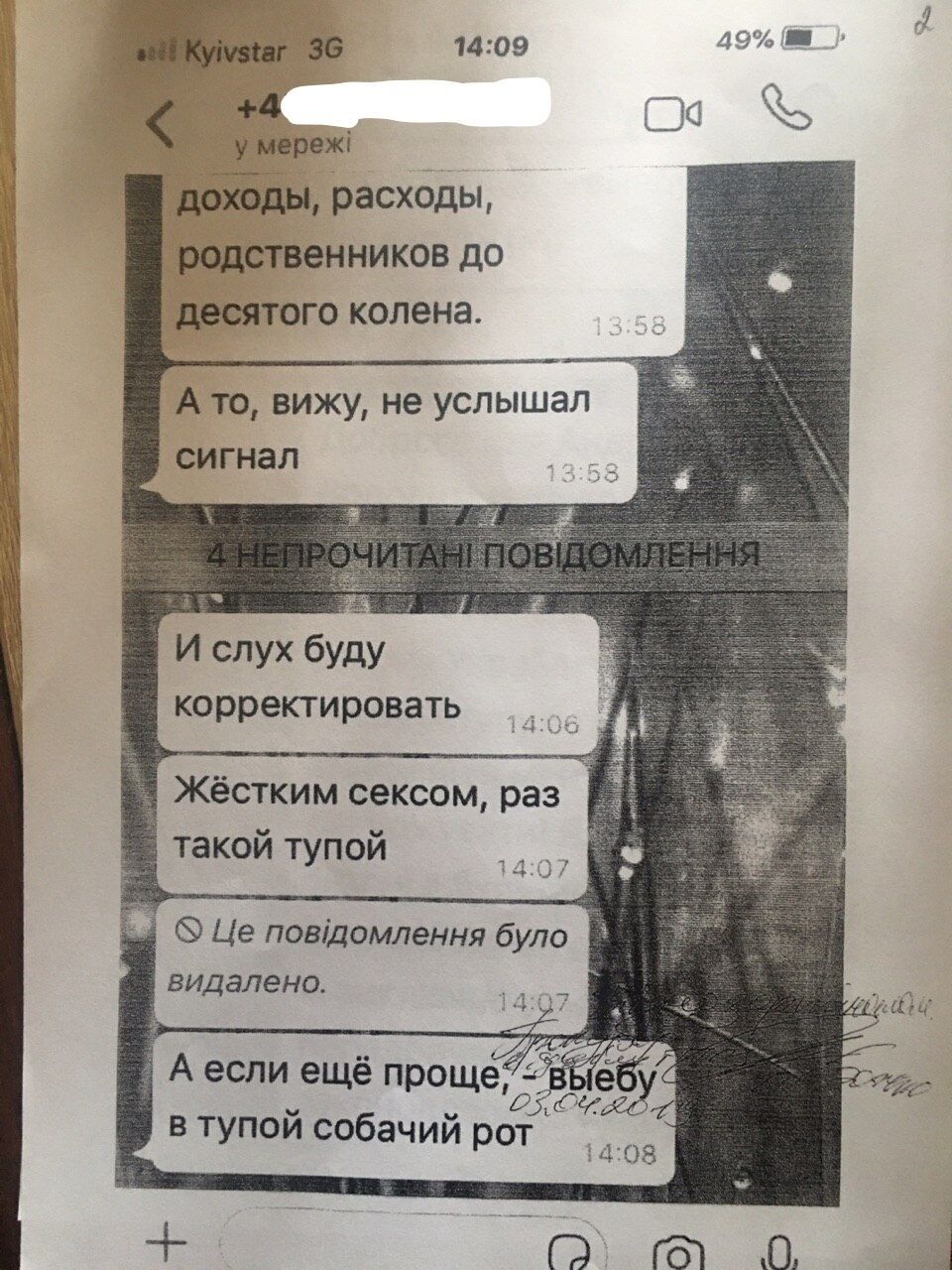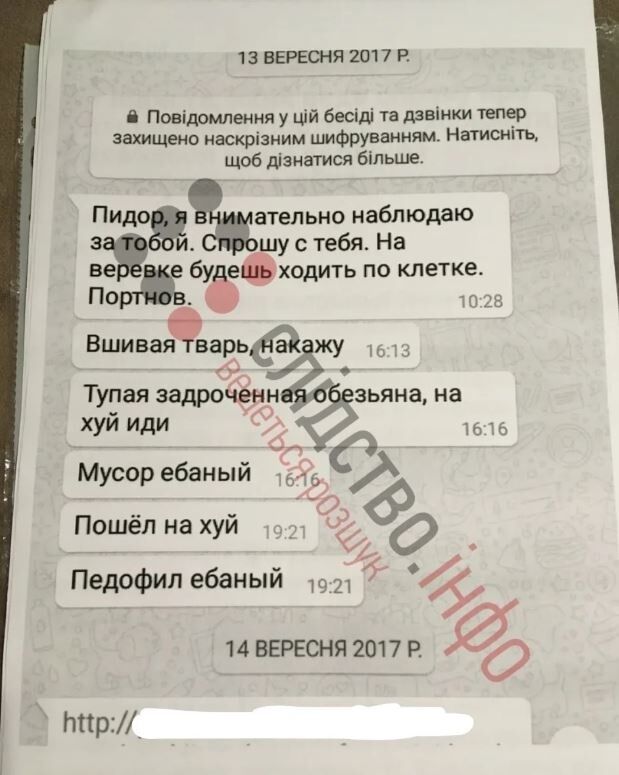 Прокурор розповів журналістам, що одразу після того як він намагався зв'язатися зі свідком у справі про Богословську, на його телефон надійшло повідомлення: "Доброго дня. Бачу, ви занадто активний. Виховних заходів доведеться вжити. Ще раз почую ваше прізвище, буду перетворювати на шматок лайна. Із повагою, Портнов".