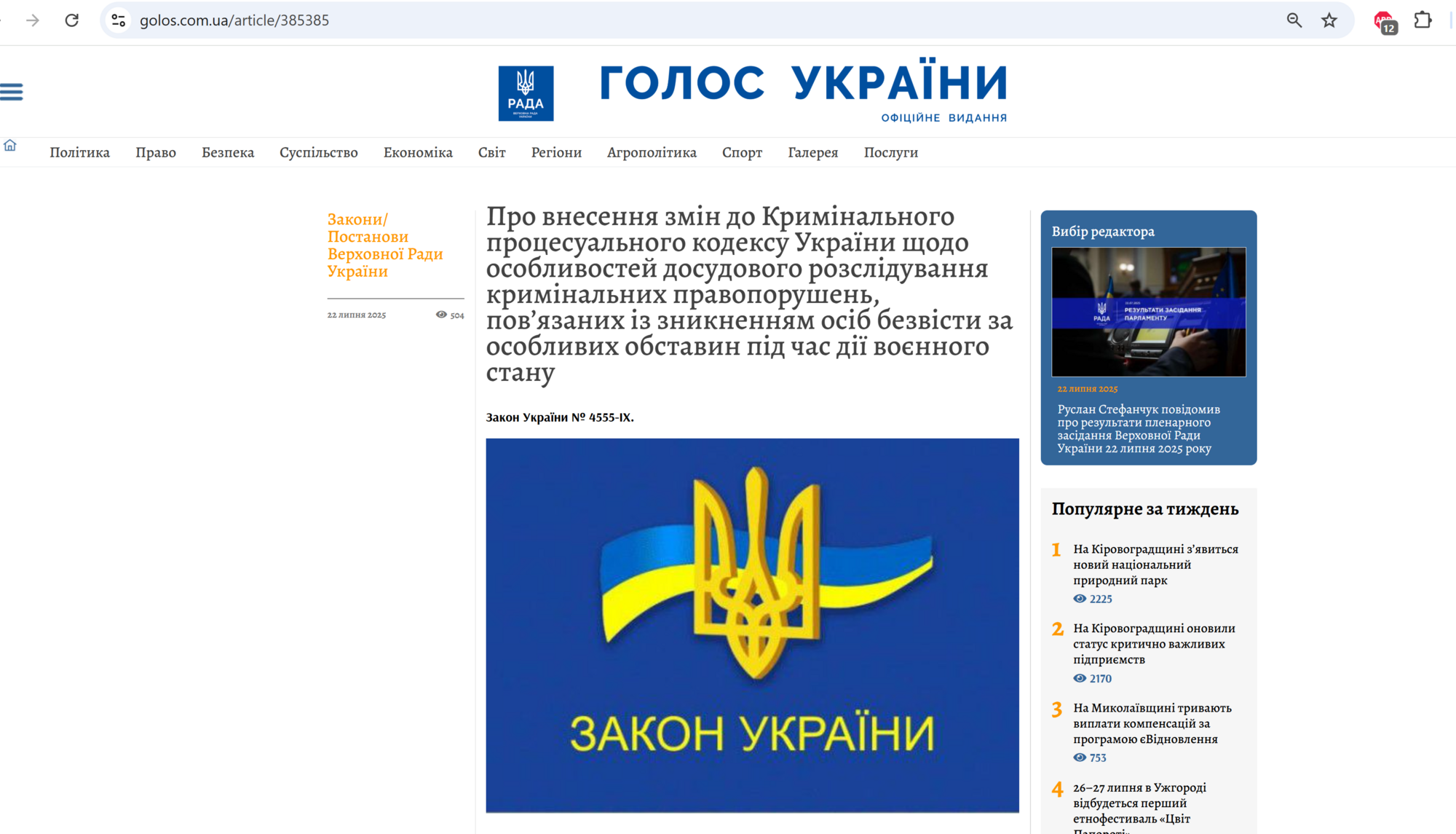 Пізно ввечері 22 липня президент підписав ухвалений цього самого дня Верховною Радою закон, який розширює повноваження генпрокурора. Після цього документ опублікували на сайті "Голосу України". Якийсь час сайт не працював, але зараз видно, що датою публікації вказано 22 липня.