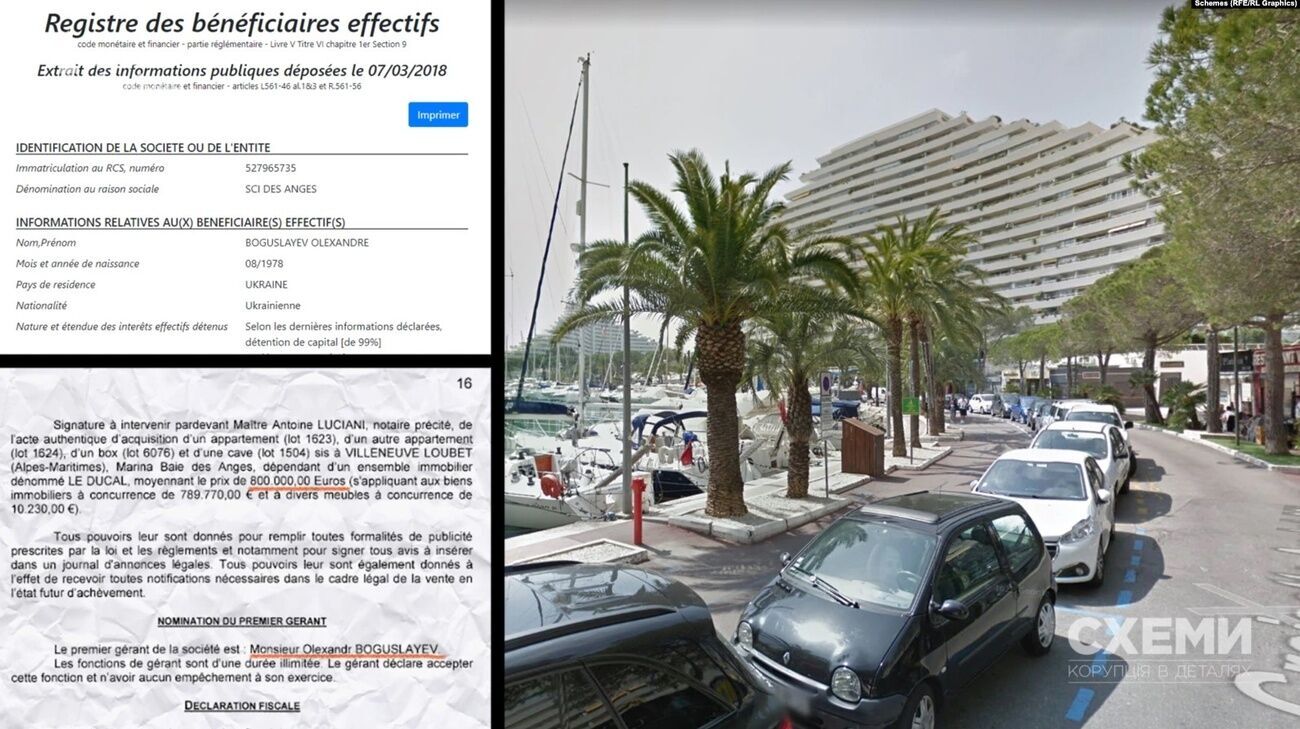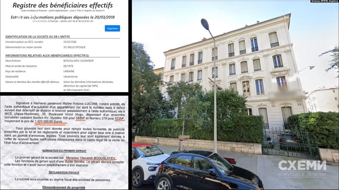 Журналісти встановили, що Олександр Богуслаєв, зокрема, володіє фірмою Sci De La Promenade Des Anglais. На неї записано квартиру й підвальне приміщення в Ніцці на Англійській набережній вартістю €850 тис.