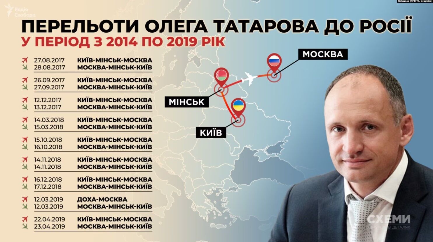За даними розслідувачів, Татаров, який у той період займався адвокатською діяльністю, літав у Москву через Мінськ (Білорусь): тричі 2017 року, чотири рази – 2018 року. Також він міг двічі 2019 року літати до Москви зі столиці Катару Дохи. Востаннє він, імовірно, літав до Росії наступного дня після перемоги Володимира Зеленського на виборах президента 21 квітня 2019 року.