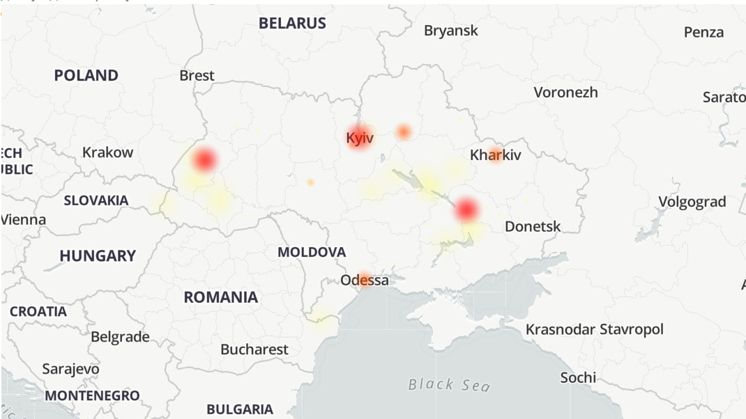 Також сервіс оприлюднив карту вимкнень зв'язку, звідки надходили повідомлення про відсутність супутникового інтернету чи перебої з ним.