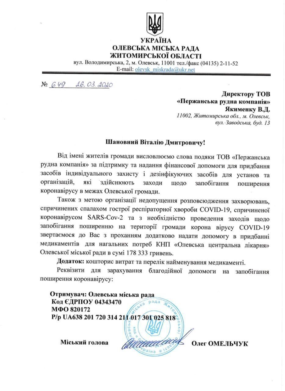 Необхідною продукцією також забезпечили медзаклади Олевська Житомирської області. "Пержанська рудна компанія" перерахувала 779 тис. грн на закупівлю необхідних засобів індивідуального захисту та засобів для дезінфекції, повідомила місцева громада Олевська.