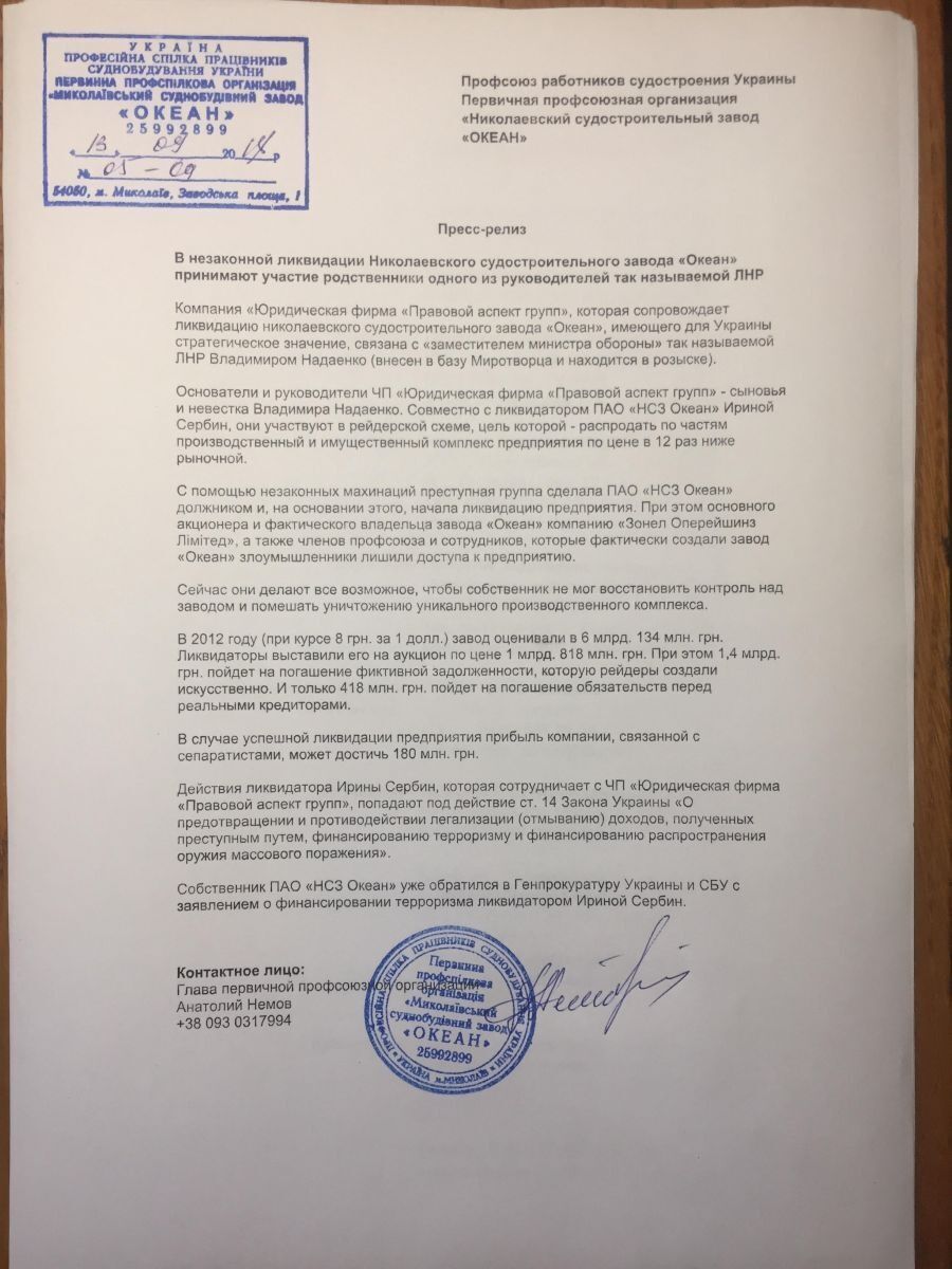 Видання "Капитал" опублікувало лист співробітників миколаївського суднобудівного заводу "Океан", які стверджують, що юридична фірма, яка супроводжує ліквідацію стратегічного підприємства, пов'язана із "заступником міністра оборони ЛНР" Володимиром Надаєнком.
