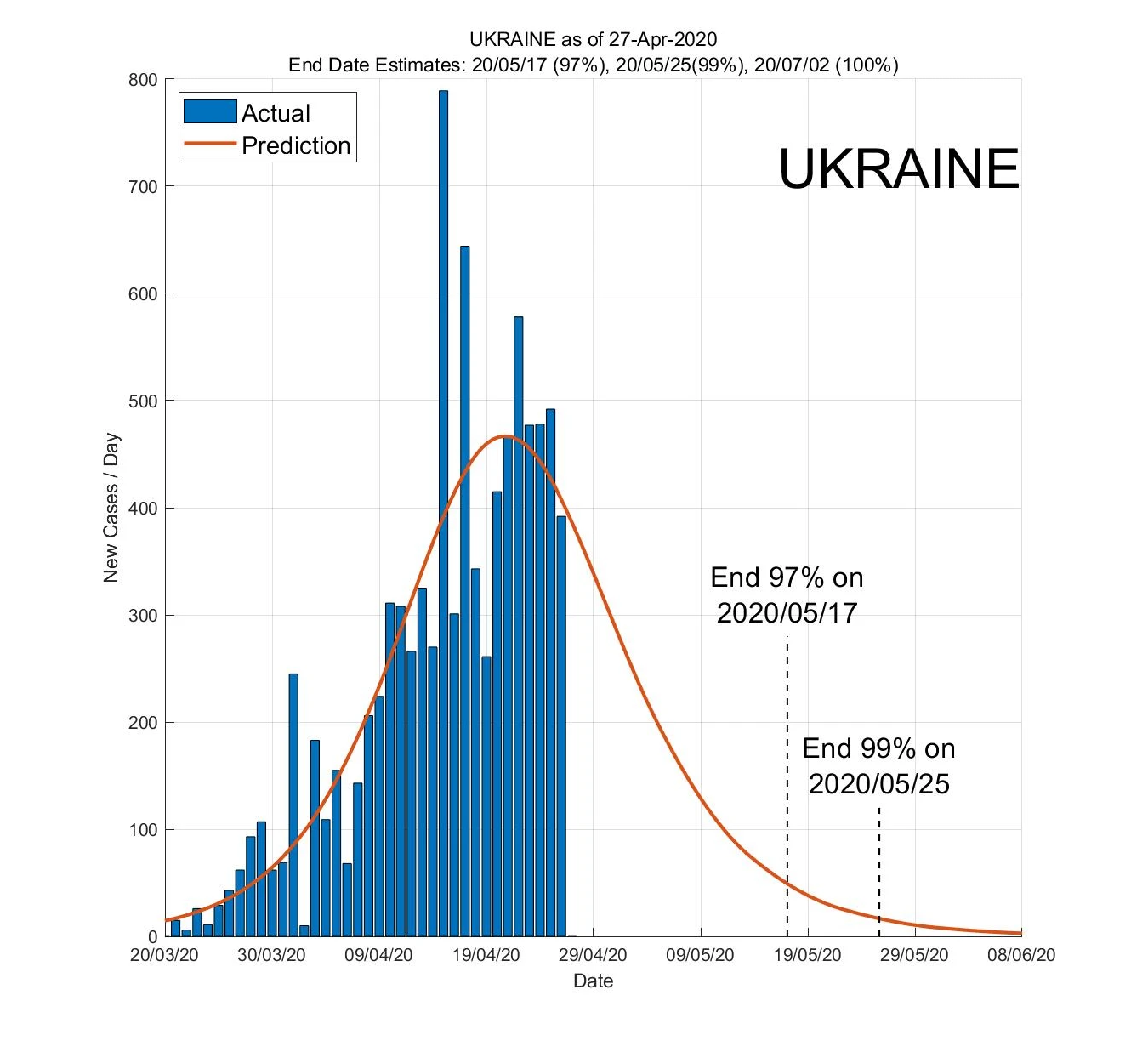 В Україні, якщо вірити дослідженню, 97% випадків зараження буде підтверджено 17 травня, 99% – 25 травня, а після 2 липня нових випадків COVID-19 уже не буде.